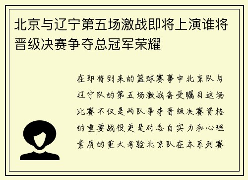 北京与辽宁第五场激战即将上演谁将晋级决赛争夺总冠军荣耀
